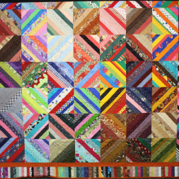 Our church quilters make and send over 300 quilts a year to Lutheran World Relief. Fabric is donated by people in the congregation. It is then cut into 10 1/2" squares to make the quilts. There is fabric left; I used the scraps to make this quilt. It takes a lot of time to do all the cutting srips and then sew them together. No idea how many hours